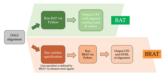 Two software utilities for highlighting sequence features of user interest, especially for proteins with regions of low sequence identity, have been developed in this work. These tools, BAT and BRAT (for B-value (Residue) Alignment Tool), are documented and available via GitHub (https://github.com/psa-lab/Protein-Alignment-Tool). As summarized in Figure 5, BRAT facilitates identifying and visualizing the correspondence between sequence segments of interest to the user (such as ligand-binding residues or extracellular loop regions) and residue numbers in one protein when aligned with a possibly sequence-divergent homolog, by using Dali structural superposition as input. BRAT alignment is written in HTML format suitable for publication or presentation, or comma-separated value (CSV) format suitable for further analysis, using single letter codes for the residues, with residue numbers labeled, and user-defined key residues highlighted. BRAT also supports automated definition of key residues based on the distance between residues and a user-specified ligand. The related BAT utility aligns and visualizes the temperature factor values (B-values) or other numeric properties recorded in the B-value column of PDB-formatted structure files, across two or more user-selected, Dali structurally aligned proteins. BAT writes the output of residues and correspondingly aligned B-values in CSV format, which can be read and analyzed further by spreadsheet tools such as Excel. These approaches provide more robust comparison between corresponding regions than a sequence-based approach for divergent sequences, such as the ligand binding sites or loop regions in GPCRs.