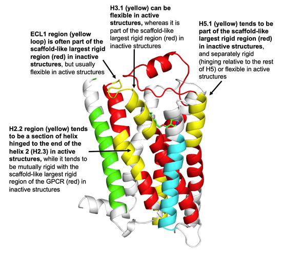 The predictive motif ultimately identified by the ProFlex machine learning analysis in this work involves a tendency for the extracellular ends of helices 2, 3, and 5 and extracellular loop 1 surrounding the ligand binding site to be mutually rigid in inactive structures, as described in Section 3.2. The ionic lock, transmission, and tyrosine toggle conformational switch motifs identified by other researchers and reviewed in [14] involve different regions: the intracellular end of helix 3, a nonoverlapping segment of helix 5, and regions in helices 6 and 7. Thus, the ProFlex analysis provides new information and reveals commonalities in the ways different inhibitors induce an off state in class A GPCRs. This is important, because GPCRs comprise ~34% of all approved human drugs [15], and the goal of drug design for many GPCRs is to downregulate their activity. Beta blockers are one well-known class of inhibitory GPCR drugs, reducing blood pressure to substantially reduce cardiovascular risk and intraocular pressure in glaucoma to prevent retinal damage. Other GPCRs are targeted to control schizophrenia, allergies, and depression [16]. Our goal is to identify key regions in proteins that regulate their activity, on which researchers can then focus to improve drug design, as discussed in the Conclusions.