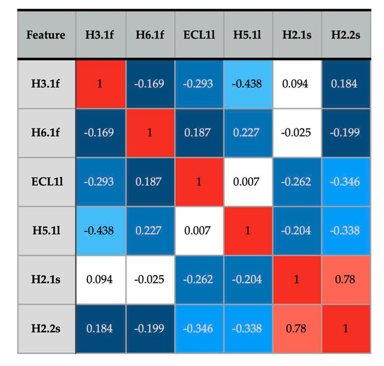 We also asked: To what extent were the most predictive flexibility features correlated? For instance, when ECL1 was observed to be part of the largest rigid region (resulting in feature ECL1l), was adjacent H3.1 flexible (H3.1f) or not? Correlation analysis can help us understand whether the flexibility features work together or are relatively independent in influencing GPCR activity. To address this, Figure 8 shows pairwise correlation of the six features in the most accurate predictor (Table 2). The only highly correlated features were H2.1s and H2.2s; in structures where the N-terminal segment of helix 2 is separately rigid (in the H2.1s state), the central segment of helix also tends to be separately rigid (H2.2s), with a correlation coefficient of 0.78. Seventy percent of the H2.1s and H2.2s occurrences are in active GPCRs. All other feature pairs in Figure 8 have absolute correlation values less than 0.45. Thus, most predictive features behave fairly independently of each other, while together being good predictors of an active or inactive GPCR state.