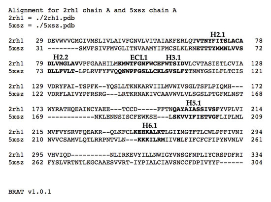 BRAT alignment (HTML view) of the sequences from PDB entries 2RH1 (human β2-adrenergic receptor) and sequence-divergent 5XSZ (zebrafish lysophosphatidic acid receptor 6; 21% identical to human β2-adrenergic receptor), which highlights in boldface the residues in 2RH1 and 5XSZ corresponding to the key features discussed in Section 3.2. Annotations of those regions appear as H2.1, etc., above the sequences.