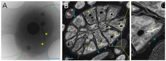 Magnetosomes and flagella of magnetotactic bacteria. (A) Bilophotrichously flagellated MO-1 cells possess two sheathed flagellar bundles (green arrow) and one magnetosome chain (yellow arrow). (B) Peritrichously flagellated ellipsoidal magnetoglobule with flagella (blue arrows) and magnetosomes (yellow arrows). Only the portion of flagellar filaments in the surface matrix was preserved during sample preparation. Scale bar is equal to 0.5 µm. Courtesy of the electron cryotomography micrograph (A) from Dr. J. Ruan and Professor K. Namba, and of the Scan-TEM high-angle annular dark-field (STEM-HAADF) mode micrograph (B) of ultrathin sections of high-pressure freezing/freeze substitution fixation (HPF/FS) fixed ellipsoidal magnetoglobule from Professor N. Menguy and Dr. A. Kosta.