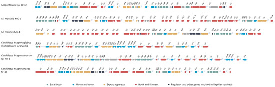 Organization of flagella genes in model magnetotactic bacteria. The data are derived from genomic data of amphitrichously flagellated Magnetospira sp. QH-2 [10], bilophotrichously flagellated M. massalia strain MO-1 [18] and M. marinus strain MC-1 [19], peritrichous flagellated spherical magnetoglobules Ca. M. multicellularis Araruama [20], Ca. Magnetomorum strain HK-1 [21], and ellipsoidal magnetoglobules Ca. Magnetananas updated from the incomplete genome sequence [22]. Separated localization of the gene clusters is marked by double slashes. Arrows show the genes and their transcriptional direction; their lengths are proportional to the size of the genes.