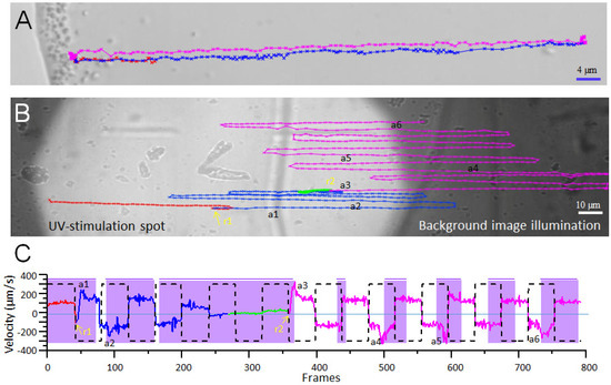 We have not identified genes that encode for either cryptochrome or proteorhodopsin in the genomes of Mangetospira sp. QH-2 [10], M. massalia MO-1 [18], spherical magnetoglobules [21,78], or incomplete genomes of ellipsoidal magnetoglobules. Therefore, the photo-sensing observed in these magnetotactic bacteria might be performed with other kinds of photoreceptors, or indirectly through chemical and physical reactions. Short wavelength light induces photoreaction and creates active oxygen species, which modify physiological conditions and triggers cellular reaction. In ellipsoidal magnetoglobules, we observed the fence-like structure, which looks like photosynthetic membrane lamellae and could be an appropriate candidate for accommodating the photoreceptors involved in photo-sensing [8]. It might also function as a grating to relay and convert light signals. Multicellular magnetotactic prokaryotes displayed a helical trajectory of swimming and reacted to illumination with UV-light perpendicular to the translation direction. They changed the magnetotaxis direction and velocity suddenly within the illumination area. Therefore, the magneto-photokinesis is unlikely to be a result of the detection of an intracellular spatial light gradient. The sudden change of swim direction under constant illumination would suggest the cumulating effect of periodical exposure of photoreceptive structures to UV-light, or the production of harmful by-products. Therefore, multicellular magnetotactic prokaryotes reversed their swimming direction to escape from the deleterious light. It remains an enigma how thousands of flagella of 60–80 cells coordinate their rotations to propel the swimming direction away from the default magnetotaxis orientation.