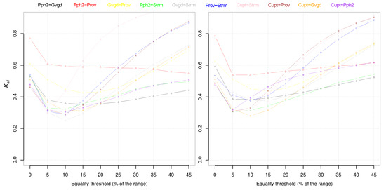 While the index measures the proportion of pairs of predictions for which conflicting orderings are observed, the index focuses only on extreme conflicting orderings. In practice, users might use the index for the identification of similar p-tools looking for values close to one. Conversely, users might use the index for the identification of different p-tools looking for values close to zero. Beyond these considerations, the ranges and the directions of and are similar so that values closed to 1 indicate that pair of p-tools are likely to order all pairs of mutations in a similar way, while values closed to 0 indicate they are likely to order them differently. Similar counting arguments to those used with the index, can be used to asses the effect of percentage equality thresholds on the index. Differently from , a monotonic decreasing behaviour is observed for for increasing values of the percentage equality threshold. However, since we expect that only dissects the inner consistency information already provided by its more general counterpart, practical evaluations were performed with the percentage equality threshold derived from independent studies (5%).