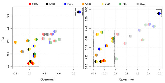 Under this baseline, we first considered the Kendall rank correlation coefficient () [23] measuring the ordinal association between two measured quantities. Briefly, given a pair of p-tools and a set of target mutations, high values of are expected whenever target mutations receive similar ranks in both tools. Formally, let be a set of mutations with n being the number of mutation sites multiplied by the number of allowed mutations per site. Also, let denote the effect of mutation m predicted by a given p-tool S with be the most informative scale provided by S. In addition, let be the less-damaging-than relation induced by S on mutations and so that if , . Finally, to simplify the notation, for any p-tool S, three orderings are possible for any pair of mutations and , namely, , , and , .