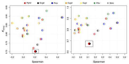 vs. Spearman for the BRCA1-SGE (left) and BRCA1-HDR (right) datasets. The top-right rectangles point out the most correlated p-toleftols. The bottom-left rectangles point out the Cupsatt/d correlations.