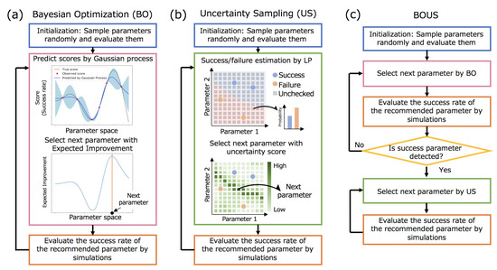 Flowcharts of efficient region search of successful parameters by using Bayesian optimization (a) and uncertainty sampling (b). (c) The combination of Bayesian optimization (BO) and uncertainty sampling (US) (BOUS) for successful parameter region search.