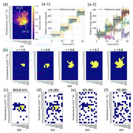 Figure 3a shows the success rate distribution of the F1-motor rotation based on Newtonian dynamics simulations for all parameters. Figure 3a-1,a-2 are examples of angle trajectories of F1-motor rotations in Figure 3a, and their success rates were 1 and 0.2, respectively. In this system, the rotation tended to be successful when the temperature was quite low, around 1 K, and when the EVI was as large as several tens to several hundreds of times of the default parameter. The region of successful parameter changes is shown in Figure 3b according to the criteria (Success threshold ).