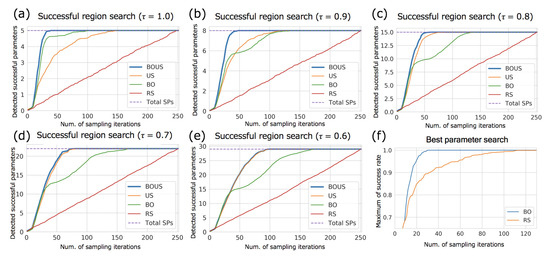 To accurately evaluate the performances of the sampling methods, we calculated the performances of successful parameter search by randomly changing the initial points. Figure 4a–e show the numbers of detected successful parameters as functions of the number of sampling points for each success threshold. Here, the initial sampling number was fixed to 10. To evaluate the effect of different initial samplings, we repeated 100 trials using different initial points and averaged the results. We listed the number of iterations in the best and worst cases to find all successful parameters in Supplemental Table S1. As shown in Figure 4a–e, BOUS, US, and BO showed better performances compared to RS; particularly, BOUS surpassed the other machine learning-based approaches. For example, when the threshold = 1, BOUS identified all successful parameters with 15 iterations in the best case and with 40 iterations in the worst case as shown in Supplemental Table S1. The reason why the performance of BOUS was higher than that of US, particularly for larger thresholds, is considered to be that successful parameters can be searched quickly based on Bayesian optimization in the early stages of sampling. We showed the search performance to detect a successful parameter using BO and RS in Figure 4f. Each line is the average of 100 search trials with different initial parameters. The result showed that BO required only 30 samples to find a successful parameter even in the worst case, while more than 100 samples were needed by RS in some cases. For US, if there is only one phase, i.e., no successful cases have been found, the search by US will be closer to RS because no boundary is defined. The performance of US is considered to be inferior to BOUS, as time is required to find a successful parameter when the threshold is large. In contrast, when the threshold was less than 0.7, the performance of BOUS was nearly the same as that of US. This may be because when the threshold is small, the region of the successful parameter is large and can thus be immediately found by US. BO showed relatively high performances when the threshold was 1.0. In this case, the number of successful parameters was five, and BO could find these parameters during searching for the highest rate. On the other hand, it was confirmed that BO is not suitable for the exhaustive search of the successful parameters because the successful parameter is large when the threshold is small. We summarized the reduced performances of sampling iterations of BOUS, US, BO, and RS compared to exhaustive search in Table 1. The listed values of each sampling algorithm are the numbers of samplings required to detect all successful parameters with a probability of 95% or higher. The values in parentheses indicate the ratios of the number of calculations to the exhaustive search. From this result, the computational cost to identify the successful region can be reduced to 12.3% compared to exhaustive search by using BOUS when = 1.