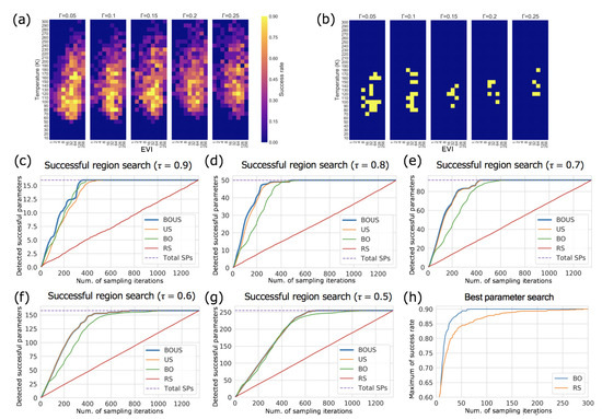 Results of Langevin dynamics simulations. (a) Success rate distribution in the parameter space. (b) Successful parameter region (yellow) with . (c–g) show performances of parameter region search using BOUS, US, BO, and RS. The success thresholds are 0.9 (c), 0.8 (d), 0.7 (e), 0.6 (f), and 0.5 (g), respectively. (h) shows the performance of BO and RS for the best parameter search.
