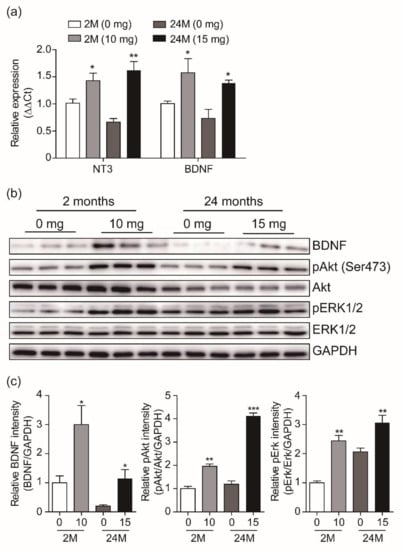 - Lee, J.; Seroogy, K.B.; Mattson, M.P. Dietary restriction enhances neurotrophin expression and neurogenesis in the hippocampus of adult mice. J. Neurochem. 2002, 80, 539–547. [Google Scholar] [CrossRef]