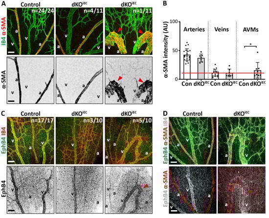 Arterial- and venous-associated markers localize normally in dKOiEC. (A) IB4 (green) and alpha smooth muscle actin (α-SMA, red) staining of Tx-treated control (n = 24) and dKOiEC (n = 11; 4/11 without AVM formation; 6/11 with α-SMA-negative AVMs; 1/11 with α-SMA-positive AVM) retinas at P6. α-SMA grayscale images are shown for visual clarity. (B) Quantification of α-SMA signal intensity per vessel type (arteries, veins, AVMs) in Tx-treated mice at P6. The red line indicates background noise level. (C) Ephrin type b receptor 4 (EphB4, green) and IB4 (red) staining of Tx-treated control (n = 17) and dKOiEC (n = 10; 3/10 without AVM formation; 2/10 with EphB4-negative AVMs; 5/10 with EphB4-positive AVMs) retinas at P6. EphB4 grayscale images are shown for visual clarity. (D) EphB4 (green/white), α-SMA (red) and IB4 (white) staining of Tx-treated control and dKOiEC retinas at P6. Red arrowheads indicate AVMs. a = artery. v = vein. Scale bar: 50 µm. * p < 0.05.