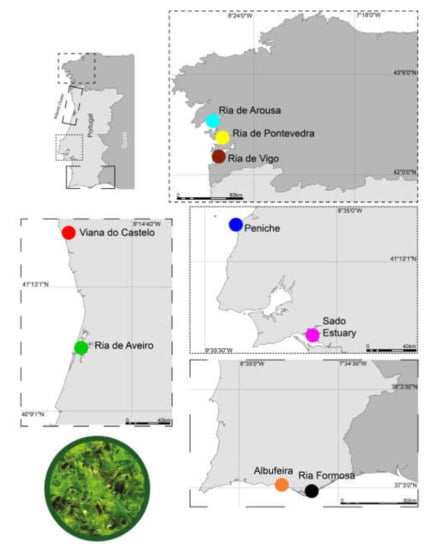 Sampling locations of Ulva spp. along the Atlantic western and southwestern Iberian coast: Albufeira (Al), Peniche (Pe), Ria de Arousa (RAr), Ria de Aveiro (RAv), Ria Formosa (RF), Ria de Pontevedra (RP), Ria de Vigo (RV), Sado Estuary (SE), and Viana do Castelo (VC).