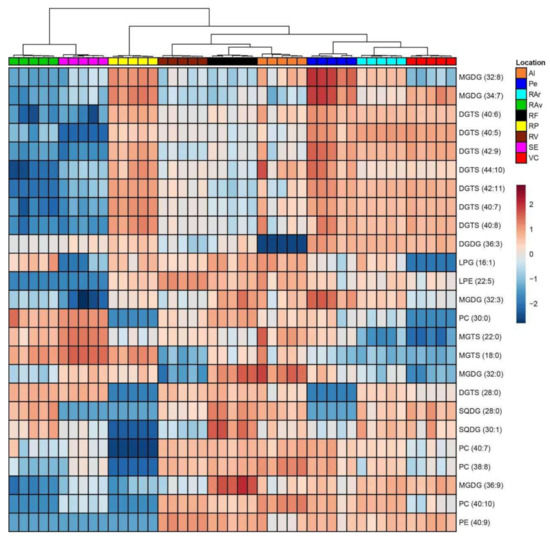 Data sets of the 201 lipid species were further surveyed for exploratory purposes using PCA. The visualization of samples grouped with location was obtained, but there was not a clear separation between groups (Supplementary Figure S6). The eigenvalues of the two first principal components represented 54.1% (PC1, 31.9%; PC2, 22.3%). Hence, dataset was sorted using the lowest q-values along false discovery rate (one-way ANOVA, post-hoc Tukey’s HSD test and FDR Benjamini and Hochberg procedure) and the top 25 lipid species displaying the lowest q-values were ranked and used to create the heatmap (Figure 2). The top 25 list included five MGDG, one DGDG, two SQDG, four PC, one LPG, one LPE, one PE, eight DGTS, and two MGTS species (Supplementary Information, Table S4). The dendogram showed the separation of the nine locations (Figure 2). The first level of separation was evidenced between specimens from RAv and SE and the remaining origins. The second level of separation distinguished Ulva species from RAv, SE, and RP from the six remaining groups. Remaining groups were differentiated in six clusters in the third and fourth levels of separation.