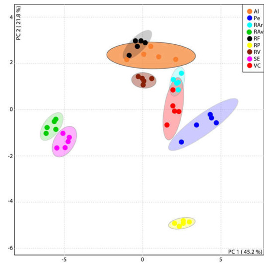 A new PCA considering these top 25 lipid species was performed and a new grouping was plotted (Figure 3). The eigenvalues of the PC1 plus PC2 increased, explaining now 67% of total variance of the observations. PCA analysis of the top 25 lipid species LC–MS data set showed seven groups representing each individual location and two overlapped groups: Al and RF (accounting for the southern coast region) and VC and RAr (accounting for the northern coast region). Along axis I (PC1), RP, Pe and RAr-VC groups were positioned closer together and opposite to RAv and SE locations, while along axis II (PC2) RP, Av, SE and Pe were discriminated laying opposite to RV and the RAr-VC and Al-RF groups.
