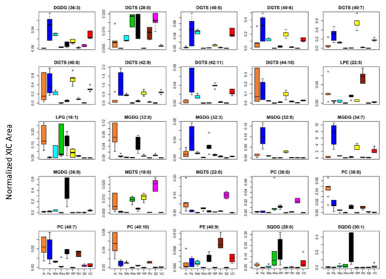 The relative abundance of lipid species from each class was then compared (bar graphs in Figures S1–S5) and differences were recorded in some classes of specimens originating from different locations. In the class of MGDG, the most abundant lipid species in specimens collected from Pe, RAr, RP, RV, VC was MGDG (34:7); the lipid species MGDG (34:8) was the most abundant in specimens from Al, RF, and SE; and MGDG (36:6) was the most abundant in specimens produced in RAv. In the case of lyso galactolipids, MGMG 16:0 was the most abundant in Ulva spp. from Al, RAr, RF and SE while MGMG (16:4) was the most abundant in Ulva spp. collected from RAv, Pe, RV, VC, and RP. A more consistent pattern independent of geographic origin was detected for the remaining glycolipids from classes DGDG, DGMG, and SQDG with DGDG 34:2 and DGDG 34:3; DGMG 16:0; and SQDG (34:1) being the most abundant species, respectively. In the classes of phospholipids, PC (30:3) and PI (38:8) were much more abundant in Ulva spp. collected from RP while, in the remaining locations, PC (36:2) and PI (34:2) were generally the most abundant species. PG class profile presented a somewhat variable profile across different origins inferred by the abundant PG (34:2) in AL, RAv, RF, and RV; PG (34:4) in PE and VC; and PG (40:6) in RP and RAr. LPC (16:0) and PE (34:2) were reliably the abundant species in the corresponding classes. In betaine lipids, DGTS (34:4) and MGTS (18:4) were generally the most abundant species. Exceptions were registered for DGTS (34:3), the most abundant species in RP; DGTS (32:1), predominant in the cases of RAv and SE; MGTS (16:0), abundant in the lipidomes from Ulva spp. collected in Pe, RAv, and SE; and MGTS (18:3), more abundant in the RP.