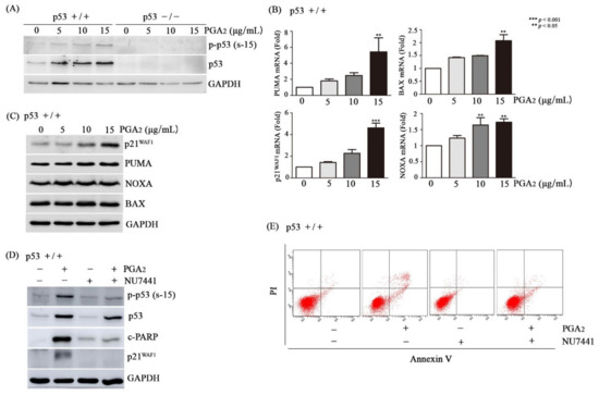 Supplementary materials can be found at https://www.mdpi.com/2218-273X/10/3/492/s1, Figure S1: Induction of apoptosis by PGA2 in HCT116 cells. Figure S2: Phosphorylation of p53 at Ser-46 by PGA2. Figure S3: Measurement of p53 target genes. Figure S4: Densitometric analysis of p53 target genes. Figure S5: The effect of NU7441 on survival of HCT116 p53-/- cells. Figure S6: The subcellular localization of p53 expression in PGA2-treated cells. Figure S7: The effect of CHX on the PGA2-induced apoptosis in HCT116 cells. Figure S8: The effect of knockdown of PUMA and NOXA expression on PGA2-induced apoptosis. Figure S9: The effect of PFT-α on the PGA2-induced increase of DR5 mRNA. Figure S10: Phosphorylation of histone H2AX by PGA2. Figure S11: Measurement of pro-apoptotic p53 target genes in PGA2-treated cells. Figure S12: Induction of p53 target genes by nutlin-3. Figure S13: Analysis of cytochrome c release in PGA2-treated cells. Figure S14: The effect of PGA2 on the growth of HCT116 cells and HCT116 p53-/- cells. Figure S15: The effect of PGA2 on the distribution of cell cycle of HCT116 cells and HCT116 p53-/- cells.