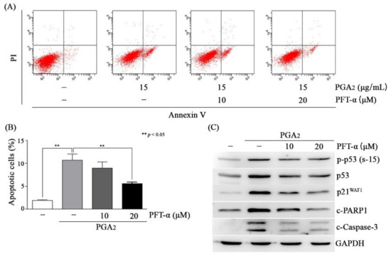 The effect of pifithrin-α (PFT-α) on PGA2-induced apoptosis in HCT116 cells. (A,B) HCT116 cells treated with indicated concentrations of PFT-α for 1 h were incubated in the absence or presence of PGA2 (15 µg/mL) for another 18 h. Cells were then subjected to annexin V assay. The representative images and statistical analysis of three independent experiments were shown in (A) and (B), respectively. The result of three independent annexin V assay was presented as mean SEM. (C) Whole cell lysates (WCLs) were prepared and subjected to immunoblot analysis against indicated proteins using GAPDH as an internal reference protein.