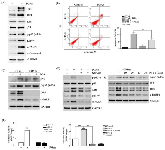 Then, we speculated that proteins of p53 target genes might play a critical role in PGA2-induced apoptosis. To prove this speculation, we analyzed the effect of cycloheximide (CHX), an inhibitor of translation, on PGA2-induced apoptosis. Pretreatment of CHX prevented the induction of apoptosis by PGA2 (Figure S7A,B), and cleavage of both PARP1 and caspase-3 as well without an effect on phosphorylation of p53 (Figure S7C), implying the critical role of de novo proteins synthesized by p53 in this apoptosis model. Although PUMA and NOXA proteins were synthesized by p53, knockdown of PUMA and NOXA using siRNAs did not suppress PGA2-induced apoptosis (Figure S8). Not only pro-apoptotic BCL-2 family proteins but also death receptor (DR) proteins such as DR4 (tumor necrosis factor receptor superfamily member 10a, TNFRSF10A), DR5 (tumor necrosis factor receptor superfamily member 10b, TNFRSF10B), and FAS (Fas cell surface death receptor) are involved in the induction of p53-induced apoptosis [29,30]. Among death receptors, DR5 but neither DR4 nor FAS was significantly increased at the level of protein by PGA2, which was accompanied by phosphorylation of p53, an increase of p21WAF1 protein, and cleavage of both PARP1 and caspase-3 (Figure 4A). In the reporter-luciferase gene assay, the promoter activity of DR5 gene was upregulated by PGA2 treatment in HCT116 cells but not in HCT116 p53-/- cells, which was suppressed by pretreatment with PFT-α, indicating an increase of DR5 expression at the level of transcription by PGA2-induced transcriptional activity of p53 (Figure 4E).