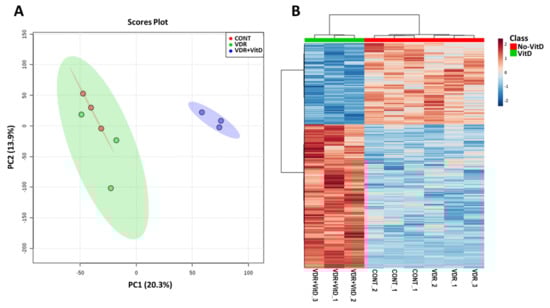Unsupervised multivariate analysis of the dataset was performed. The two PCAs, in Supplementary Figure S3, demonstrate two main sources of variation, one associated with the effect of time (8 and 24h, Supplementary Figure S3A) and other with the effect of VitD (VDR and VDR+VitD, Supplementary Figure S3B).
