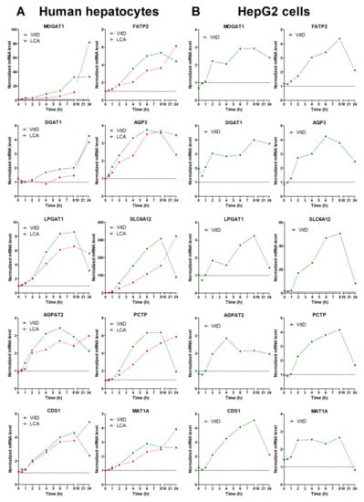DGAT1 and DGAT2, catalyze the final esterification of a fatty acyl moiety to a DG molecule to produce TG. These enzymes commit DG to being stored as TG rather than being channeled to the synthesis of phospholipids. Both DGAT enzymes may contribute to the overt activity responsible for the synthesis of TG for cytosolic lipid droplets, and both may also contribute, through different mechanisms, to the synthesis of TG for lipid droplets at the lumen of the endoplasmic reticulum and for the nascent very low-density lipoprotein (VLDL) precursor []. Both, DGAT1 (this study) and DGAT2 [] were upregulated by activated VDR, which is in agreement with a recent study showing that calcitriol treatment increased mRNA expression of DGAT1 and DGAT2 in C2C12 myotubes []. The upregulation of DGAT1/2 along with the concomitant induction of AGPAT2, MOGAT1, and LPGAT1, suggest that the activated VDR can trigger a coordinated response promoting the synthesis of TG in human hepatocytes.