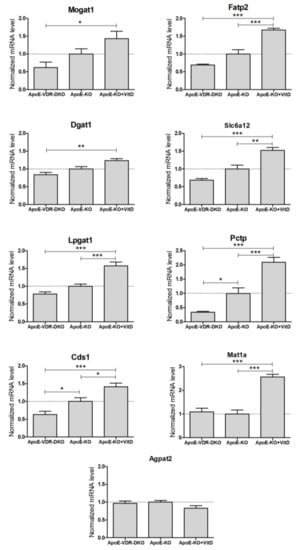New potential VDR target genes were selected from the list of differentially expressed genes. We focused on 10 of them, which are involved in lipid metabolism and have not been previously associated with VitD: MOGAT1, DGAT1, and AGPAT2 (associated with glycerolipid metabolism and TG synthesis), LPGAT1, CDS1, PCTP, and MAT1A (involved in phospholipid metabolism), and FATP2, SLC6A12, and AQP3 (responsible for the uptake of fatty acids, betaine and glycerol, respectively) (see Supplementary Table S2 for official gene names and roles).