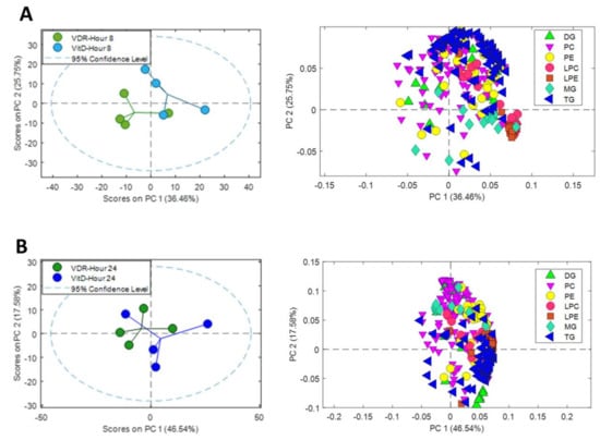In order to facilitate the visualization and to simplify the interpretation of the data, we performed separate PCAs at 8 and 24 h after VitD, including only the signals of identified metabolites from the major lipid classes (TG, diacylglycerols (DG), monoacylglycerols (MG), phosphatidylcholines (PC), phosphatidylethanlolamines (PE), lysophosphatidylcholines (LPC) and lysophosphatidylethanlolamines (LPE)) (Figure 5). A source of variation was observed between VDR cells and VDR cells treated with VitD both after 8 (Figure 5A) and 24h (Figure 5B) incubation.