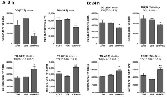 In general terms, DGs were decreased whereas TGs were increased by VitD at 8 (Figure 6A) and 24 h (Figure 6B). Several MGs species were also identified and, similarly to DGs, they also consistently decreased after VitD, however the variability among replicates was large and no statistical significance was found (data not shown).