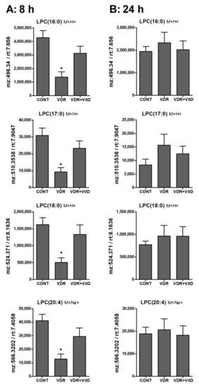 Lysophospholipids, and particularly LPC, showed higher levels in 8 h VitD-treated hepatocytes (Figure 7A), but, after 24 h, differences between these two conditions were no longer evident (Figure 7B).
