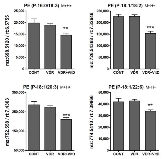 Another lipid class that was significantly altered by VitD was the PE plasmalogens (PE alkenyl ethers). They were consistently decreased upon 10 nM VitD incubation, particularly after 24 h (Figure 8).