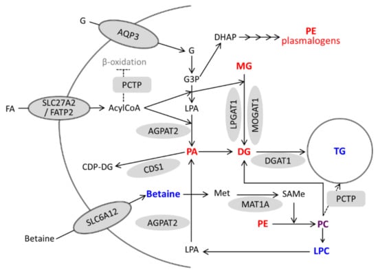 In summary, VitD triggers the activation of genes involved in the uptake of fatty acids, glycerol, and betaine, and in the metabolism of glycerolipids and phospholipids. The activation of this gene network results in decreased levels of PA, DG, MG, PE, and PE plasmalogens, and in increased levels of betaine, LPC, and TG. Moreover, many PC species decreased whereas other increased in a likely remodeling of the PC pool.