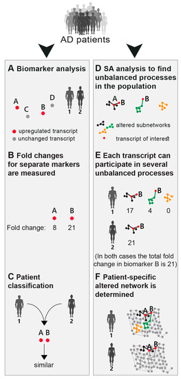 In clinics, pathologies bearing comparable mutations or biomarker expression levels would be classified as similar. However, when dealing with complex multifactorial pathologies similar biomarker expression levels in different patients may stem from different altered molecular processes [15], possibly necessitating distinct, patient-specific diagnosis and treatment. This is specifically problematic in the case of AD, which appears to be a syndrome rather than a single disease [16].