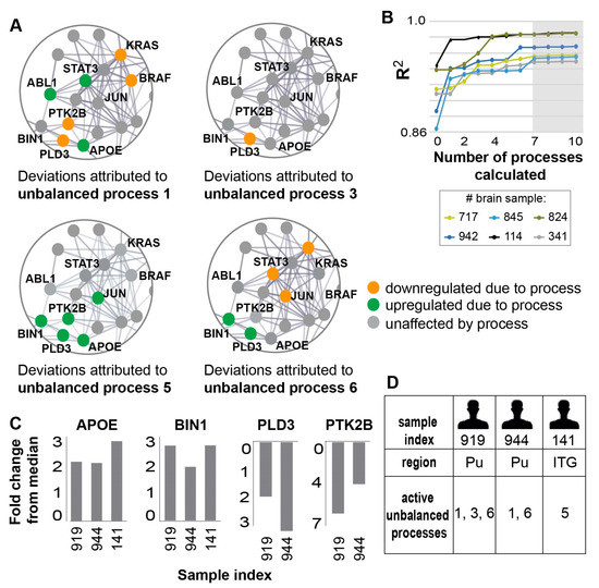 Seven unbalanced processes were identified in the 951 samples tested, underlying the disparities in biomarker expression levels in different samples. (A) Zoomed in images of four of the seven unbalanced processes identified in the dataset: 1,3, 5, and 6. For each process, the deviations in expression levels of nine transcripts are shown, demonstrating how different unbalanced processes can affect the expression levels of the same transcripts, sometimes in opposite directions. The complete information regarding the seven unbalanced processes and the transcripts affected by them can be found in Table S1. (B) R2 values of selected samples were calculated by plotting the natural logarithm of the experimental data vs. for different values of . The value of R2 approaches 1 as more unbalanced processes are added to the calculation. Mathematically, 951 unbalanced processes are calculated for each patient. However, not all of them are significant. The figure shows that the R2 plots representing different patients reach a plateau after seven processes, suggesting that the first seven unbalanced processes are necessary to reproduce the experimental data, while the rest of the processes represent random noise in the system. Six selected brain samples are shown. The gray box highlights that the addition of the unbalanced process had no significant effect on the R2 value for these samples. (C) Fold change in expression level of the four AD biomarkers in three selected samples—the selected samples demonstrate similar deviations in expression levels of these biomarkers. (D) The samples were found to harbor different sets of active unbalanced processes. Hence, similar transcript expression levels can arise from distinct altered transcriptional signatures, possibly demanding different modes of treatment as well.