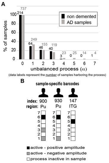 The barcodes presented in Table S4 were generated as described previously [17]. Briefly, barcodes represent a sample-specific combination of active unbalanced processes. Barcodes were generated using a custom python script. For each sample, values () were normalized as follows: If (and is therefore significant according to calculation of threshold values), then it was normalized to equal 1; if (significant according to threshold values as well), then it was normalized to equal −1; and if , then it was normalized to equal 0. Table S4 lists 52 unique barcodes that were calculated and found to repeat themselves in the 951 brain samples. The results are shown graphically in Figures 5 and 6.