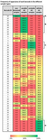 Some “blocks” of barcodes representing solely one type of sample were visible, e.g., barcode 42 characterizes only normal samples (Figure 7A), barcodes 6, 16, and 18 characterize only probable AD samples (Figure 7C), and barcodes 9, 11, 37, 43, and 45 only definite AD (Figure 7D). However, the map is complex, because it shows that a spectrum of barcodes, each characterizing a certain subset of the sample types, was identified by SA. For example, barcode 4 characterizes non-demented samples, possible, and probable AD equally, while not characterizing any definite AD samples (Figure 7). Barcodes 32, 39, and 47 characterize possible and definite AD samples with an equal frequency (Figure 7). Barcodes 23, 34, and 36 characterize possible and probable AD samples (Figure 7). Various barcodes each characterize all types of samples, e.g., 46, 30, 25, 10, and more (Figure 7).