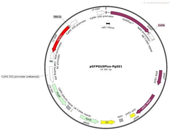 Schematic representation of the recombinant pGFPGUSPlus-Panax ginseng squalene synthase 1 (PgSS1) vector used in this study (SnapGene® software (from GSL Biotech; available at snapgene.com)).