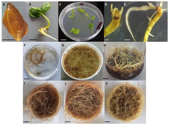 Subsequent stages of obtaining transgenic S. obtusifolia in vitro hairy root cultures. (A)- S. obtusifolia seed, (B)- S. obtusifolia 14 day old seedling used for genetic transformation, (C–E)-SOPSS hairy roots formation on S. obtusifolia seedlings after Agrobacterium transformation, (F)- SOPSS hairy roots after 7 days on Murashige and Skoog (MS) selection medium, (G)- SOPSS hairy roots after 14 days on MS solid medium, (H)- SOPSS hairy roots after 21 days on MS liquid medium I-K SOA4 (I), SOPSS (J), SOGFP (K) hairy roots after 14 days of culture on MS liquid medium used for biological studies, bar = A-2 mm, B-1 cm, C-1 cm, D-2 mm, E-5 mm, F-K-1 cm.