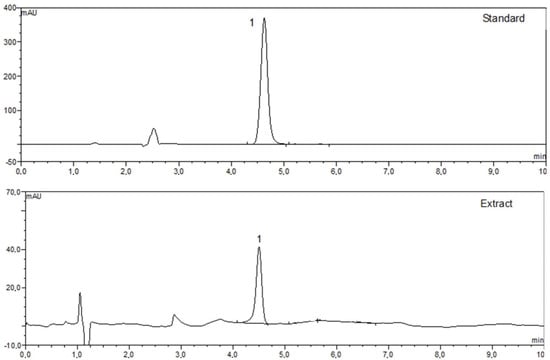 Identification and quantification of betulinic acid was conducted according to Pai et al. [] with modifications. Chromatographic analysis was carried out using an HPLC system (Dionex, Sunnyvale, CA, USA) equipped with a photodiode-array detector. Chromatographic separation was achieved on a Supelcosil RP column (C18, 4.0 mm × 150 mm, 5 µm) joined with a guard column (GOLD Drop-In guards, 10 × 4 mm, 5 µm, Polygen, Gliwice, Poland) at 24 °C. Mobile phase consisted of 14% water (A) and 86% acetonitrile (B) in an isocratic mode with injection volume 20 μL. The flow rate was 1 mL/min and the absorbance was measured at 210 nm; the time of analysis was 10 min for both standards and plant extracts. Betulinic acid in plant extracts was identified by comparing the retention time and UV spectra of the analyzed samples with those of reference standards. Quantification was based on a standard curve for betulinic acid constructed over the range of 5–250 µg/mL, the linearity of the calibration curve was verified by the correlation coefficient (r2 = 0.9979).