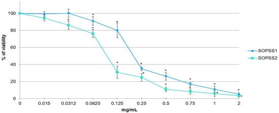 MTT assay results of transgenic SOPSS S. obtusifolia root extracts on human acute lymphoblastic leukemia (NALM6) cells. The cells were incubated with root extracts at a concentration range of 0.015–2 mg/mL for 24 h. Data are presented as the mean ± SD of triplicate independent experiments. * p < 0.05 SOPSS1, SOPSS2 vs. untreated cells.