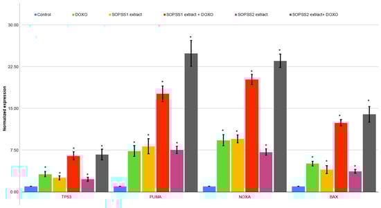 Expression analysis of apoptotic genes (TP53, PUMA, NOXA and BAX) in NALM6 cells treated with IC50 of SOPSS1 and SOPSS2 transgenic hairy root extracts, alone or co-treated with 250 nM doxorubicin, for 24 h. The gene expression was determined as described in RT-PCR methodology. Data presented as mean ± SD of at least three independent experiments. * p < 0.05 SOPPS1 or SOPSS2 alone or in combination with doxorubicin) vs. control.
