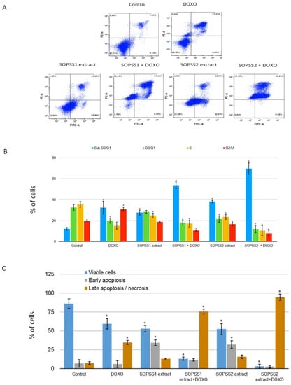(A) Apoptosis induction by transgenic SOPSS1 and SOPSS2 root extracts at their IC50 alone or in combination with doxorubicin on NALM6 cells for 24 h determined by Annexin V-FITC/PI flow cytometry-representative cytograms. (B) The diagram shows the percentage of the cell population in each phase of the cell cycle in NALM6 cells after 24-h treatment with SOPSS1 and SOPSS2 root extracts (alone or combination with doxorubicin). (C) Diagram shows percentage of cell populations divided to viable cells, early apoptotic, late apoptotic/necrotic cells. Data represent the mean ± SD of three independent experiments. * p < 0.05 SOPPS1 or SOPSS2 (alone or in combination with doxorubicin) vs. control.