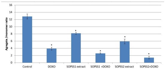 As the disruption of mitochondrial membrane potential (MMP) plays a major role in the apoptosis mechanism, the next stage examined whether transgenic SOPSS1 and SOPSS2 hairy root extracts mediated NALM6 cell death through the intrinsic apoptosis pathway. In addition, we checked the effect of both extracts in combination with a chemotherapeutic agent. Our studies showed that transgenic SOPSS1 and SOPSS2 hairy root extracts, either alone or in combination with doxorubicin, induced apoptosis as evidenced by the loss of MMP; however, a higher effect was observed for the SOPSS2 extract, alone or in combination with doxorubicin (Figure 9).