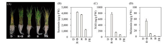 To determine the light wavelength most effective for inducing melatonin production, 7-day-old rice seedlings were challenged with cadmium for 3 days under four different LED wavelengths. As shown in Figure 1, melatonin production was not induced in response to cadmium under the dark treatment (D). Light-triggered melatonin production was highest under the R + B treatment, followed by the R and B treatments (Figure 1D). FR produced melatonin levels comparable to those of the D treatment. Similar to melatonin, its precursors serotonin and NAS were also maximally induced by R + B, followed by R and B, whereas no induction was observed under the D or FR treatments (Figure 1B,C). These data strongly suggest that melatonin induction upon cadmium treatment is completely dependent on specific light wavelengths. Maximum melatonin production under R + B treatment appears to be closely associated with the spectrum of photosynthetically active radiation, since R + B produces a higher photosynthetic rate than the sum of R and B alone [35].