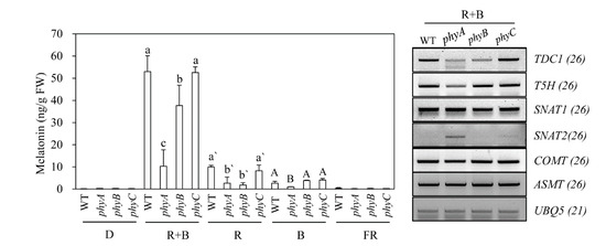 To identify a key regulatory gene among the phy mutants responsible for melatonin production, we monitored the expression of melatonin biosynthetic and catabolic genes under R + B treatment. The severe reduction in melatonin production observed in the phyA mutant was closely associated with lower expression levels of TDC and caffeic acid O-methyltransferase (COMT) (Figure 4B), which are key genes for light-dependent melatonin synthesis in response to cadmium treatment [33].