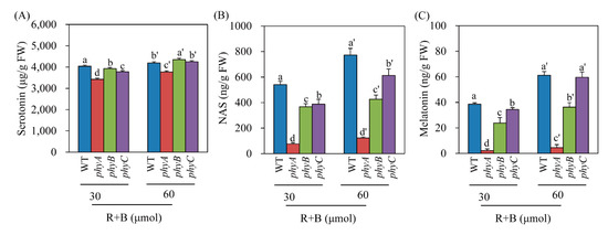 Serotonin is the only essential precursor for melatonin biosynthesis in plants [29]. In plants, the synthesis of both serotonin and melatonin is dependent on light (Figure 1) [40]. To determine whether light intensity affected the levels of serotonin, NAS, and melatonin in the phy mutants under R + B treatment, we measured these compounds in R + B treatments with two different light intensity values: 30 and 60 μmol × m−2 × s−1. Serotonin levels were indistinguishable between the light intensity treatments among WT and the phyB and phyC mutants; however, the phyA mutant had lower serotonin levels (Figure 5A). In contrast, NAS production increased as light intensity increased in WT and the phyC mutant, whereas no difference was observed in the phyA or phyB mutant, suggesting that these mutants failed to perceive light intensity differences (Figure 5B). As observed for melatonin, the WT and phyC mutant responded to increased light intensity by enhancing melatonin production (Figure 5C). However, phyA completely lost its ability to increase melatonin production as light intensity increased. Although phyB responded to light intensity, its responsiveness was lower than that of WT and the phyC mutant. These results indicate that phyA cannot perceive light as well as light intensity, resulting in a severe decrease in melatonin production in response to cadmium treatment under the R + B condition.