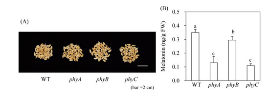 Seed melatonin levels in phy mutants. (A) Water-imbibed rice seeds after 9 h. (B) Melatonin levels in phy mutants. WT, wild type; FW, fresh weight. Different letters indicate significant differences, as determined by Tukey’s honest significant difference (HSD) post-hoc test at a level of P < 0.05.