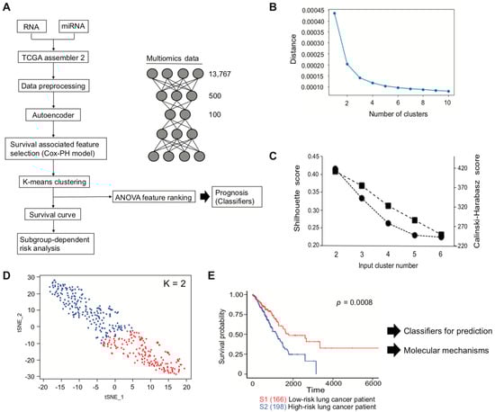 We used TCGA LUAD data for multi-omics analysis, to identify prognosis-related genes. Multi-omics data were generated by TCGA assembler 2, and the data were preprocessed before conducting the omics analysis described in the Materials and Methods section. A total of 13,767 features from RNA-seq and miRNA-seq data were used as an input, which were then encoded to bottleneck feature space of dimension 100 through the autoencoder (Figure 1A). To select the clinically associated features from the bottleneck features, univariate Cox-PH model was performed. In total, 33 out of 100 features showed a statistical significance by log-rank test (p < 0.05, Supplementary Table S1). Therefore, the 33 features were further interrogated, to determine whether they could be subcategorized depending on survival outcome. We first roughly estimated the number of clusters through the elbow method (Figure 1B) and then refined the result with more precise analyses, using the Silhouette index and Calinski–Harabasz criterion (Figure 1C; black circle (Silhouette index) and black square (Calinski–Harabasz criterion)). Both of them indicated cluster number two as an optimal number for clustering. Thus, K-means clustering was conducted with K = 2, which showed a reasonable clustering result, using t-SNE for visualization (Figure 1D). The inferred labels obtained from K-means clustering were applied to estimate patient survival, and patients were successfully sub-classed into either a poor (high-risk) or a good (low-risk) survival subtype (Figure 1E).