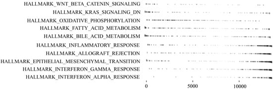 GSEA revealed that Wnt/β-catenin-signaling KRAS-signaling genes downregulated by KRAS activation that could be regulated by NF1 (Table 5), oxidative phosphorylation, and fatty acid metabolism were upregulated. Meanwhile, epithelial-mesenchymal transition (EMT) and inflammatory response, such as interferon gamma response and interferon alpha response, were downregulated in the high-risk subtype, as compared with the low-risk subtype (Figure 3). Notably, above pathways are one of the typical pathways of cancer [,].