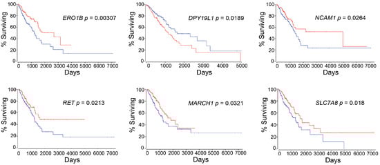 We focused on the top 25 differentially expressing RNAs that were extracted by using DESeq2, as shown in Table 7 and the RNA expression levels of the top 25 genes were investigated by using OncoLnc, whether they were associated with LUAD patient survival or not. Interestingly, six out of 25 genes, which are ERO1B (endoplasmic reticulum oxidoreductase 1 beta), DPY19L1 (dpy-19 like C-mannosyltransferase 1), NCAM1 (neural cell adhesion molecule 1), RET (ret proto-oncogene), MARCH1 (membrane associated ring-CH-type finger 1), and SLC7A8 (solute carrier family 7 member 8), were identified as survival-associated genes that can affect patient prognosis (Figure 4).