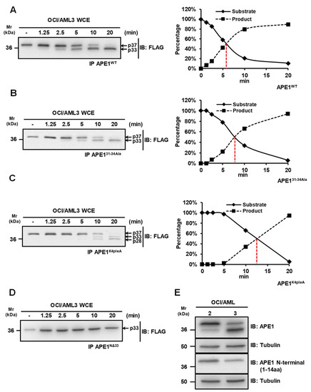 Previous studies showed that APE1 is targeted by granzymes A and K, which are able to generate truncated protein products (APE1NΔ31-35) that are not capable of repairing damaged DNA, thus leading to cellular apoptosis [11,12,22]. We previously reported that a truncated APE1 form can be detected in OCI-AML3 cells expressing the NPM1c+ mutant [13]. In order to map the cleavage site in APE1 and to identify the protease(s) responsible for protein cleavage, we performed in vitro proteolysis experiments using whole cells extracts of OCI-AML3 cells that were incubated with purified FLAG-tagged APE1 recombinant proteins from ad hoc engineered HeLa cells [7,23]. For these assays, we used different recombinant APE1 protein forms as substrates: (i) wild-type APE1 (APE1WT); (ii) an APE1 mutant in which residues Lys31, Lys32, Asn33 and Asp34 were mutated to Ala (APE131-34Ala); (iii) an APE1 mutant, in which residues Lys27, Lys31, Lys32 and Lys35 were mutated to Ala (APE1K4pleA), mimicking constitutive acetylation; (iv) an APE1 truncated form lacking the N-terminal portion of 33 amino acids (APE1NΔ33) (Figure 1). While the proteolysis kinetics of the wild-type protein was very quick, showing a 50% of cleavage upon 6 min of incubation (Figure lA), amino acid substitutions in mutated variants significantly interfered with the proteolytic event (Figure 1B–D). The 31-34Ala substitution slowed-down the kinetics of about 3 min (Figure 1B), while the K4pleA one lowered the kinetics down to 13 min of incubation, also causing a change in the pattern of proteolysis (Figure 1C). Notably, APE1NΔ33 was completely resistant to proteolysis in the investigated time range (Figure 1D), confirming that the proteolysis involved the N-terminal region of APE1.